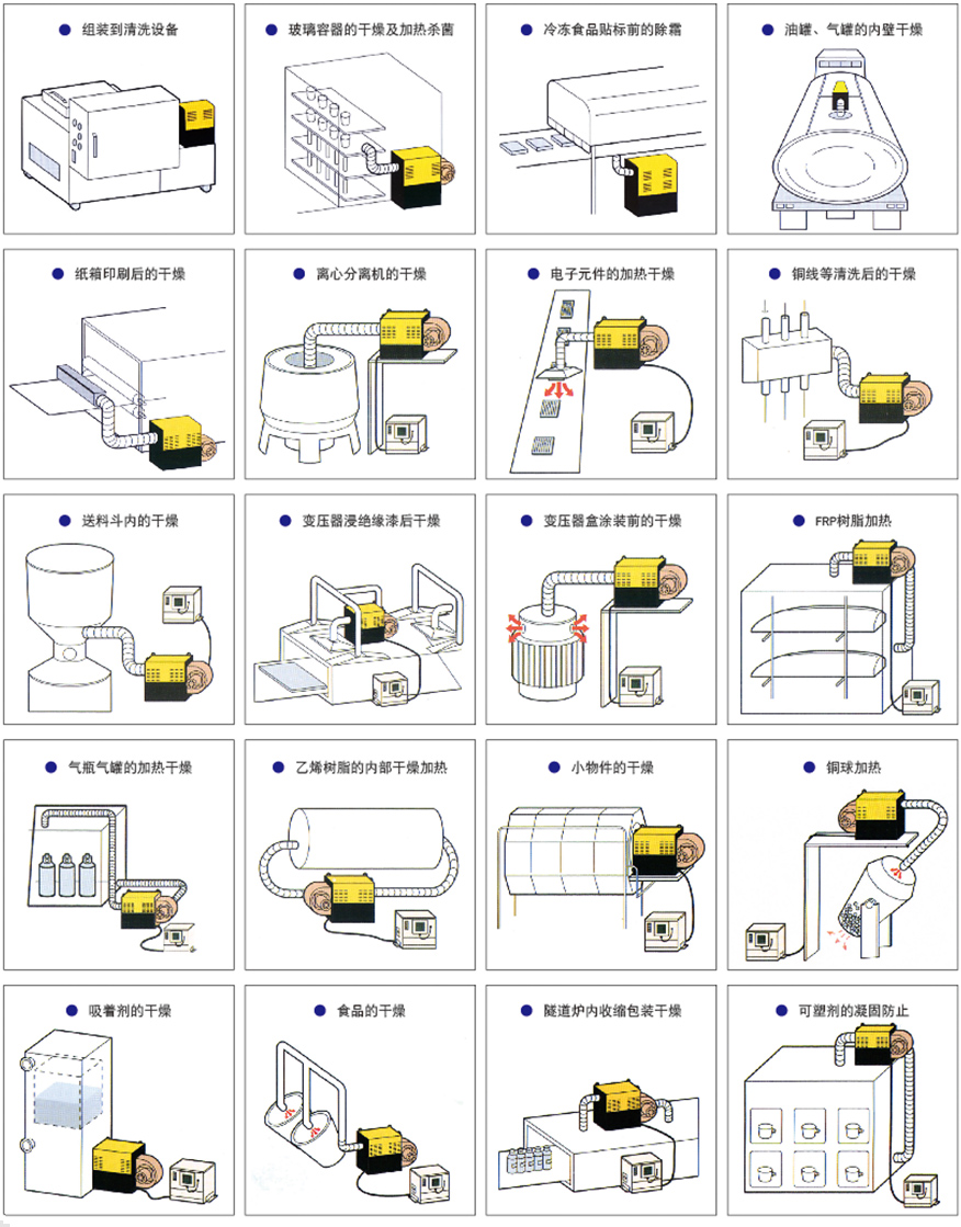 广泛应用于包装机械、食品加工、医疗机械、印刷、汽车、材料热处理、橡胶制品等行业的干燥升温。